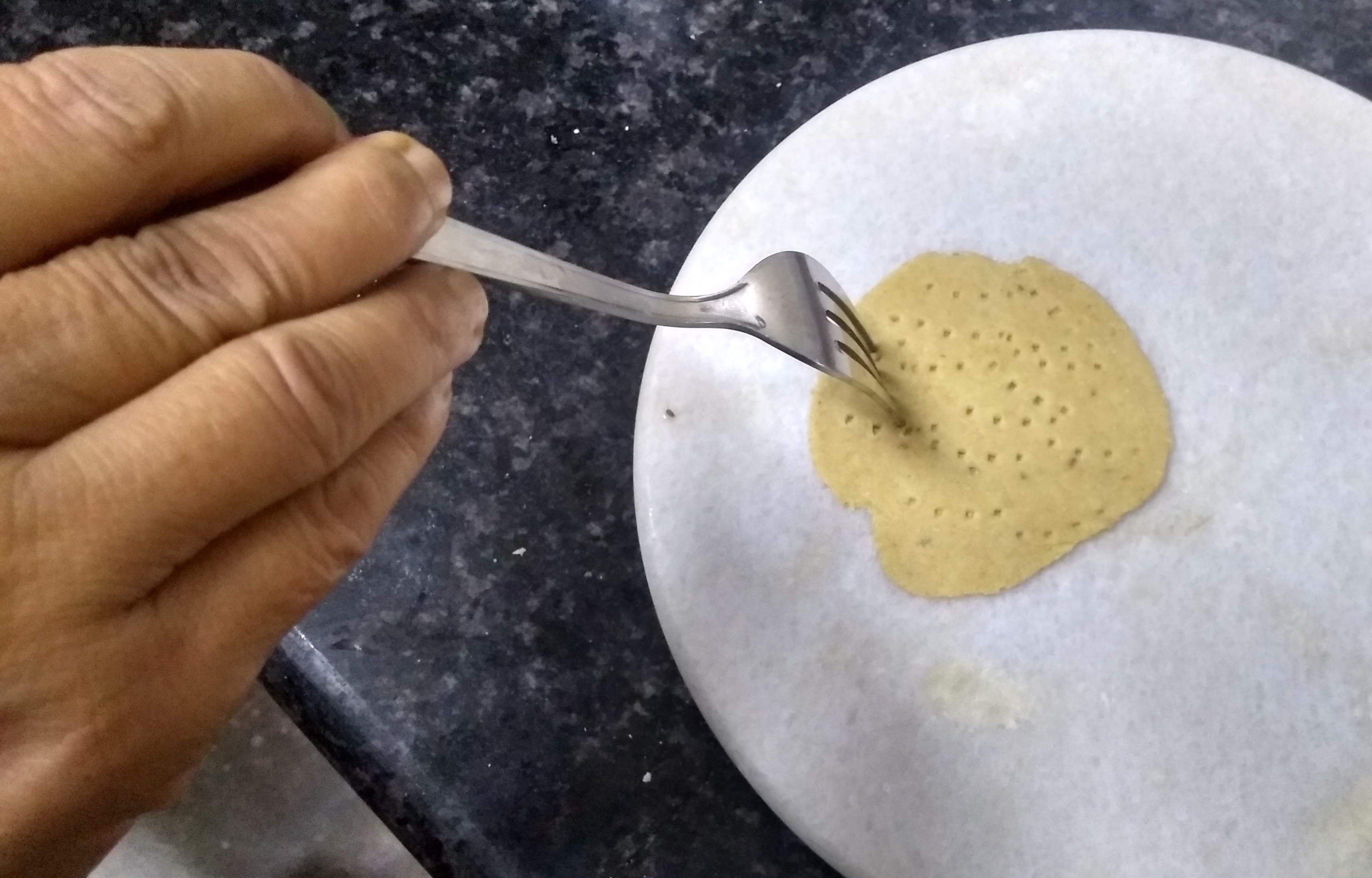 2.) In second way, you can make a big round roti of dough and with the help of a glass make circular shapes further make small dots with fork.