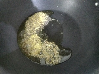 3.) Take a pan/pot add 1 tbsp of desi ghee. To it add hing, cumin seeds and let it crackle.